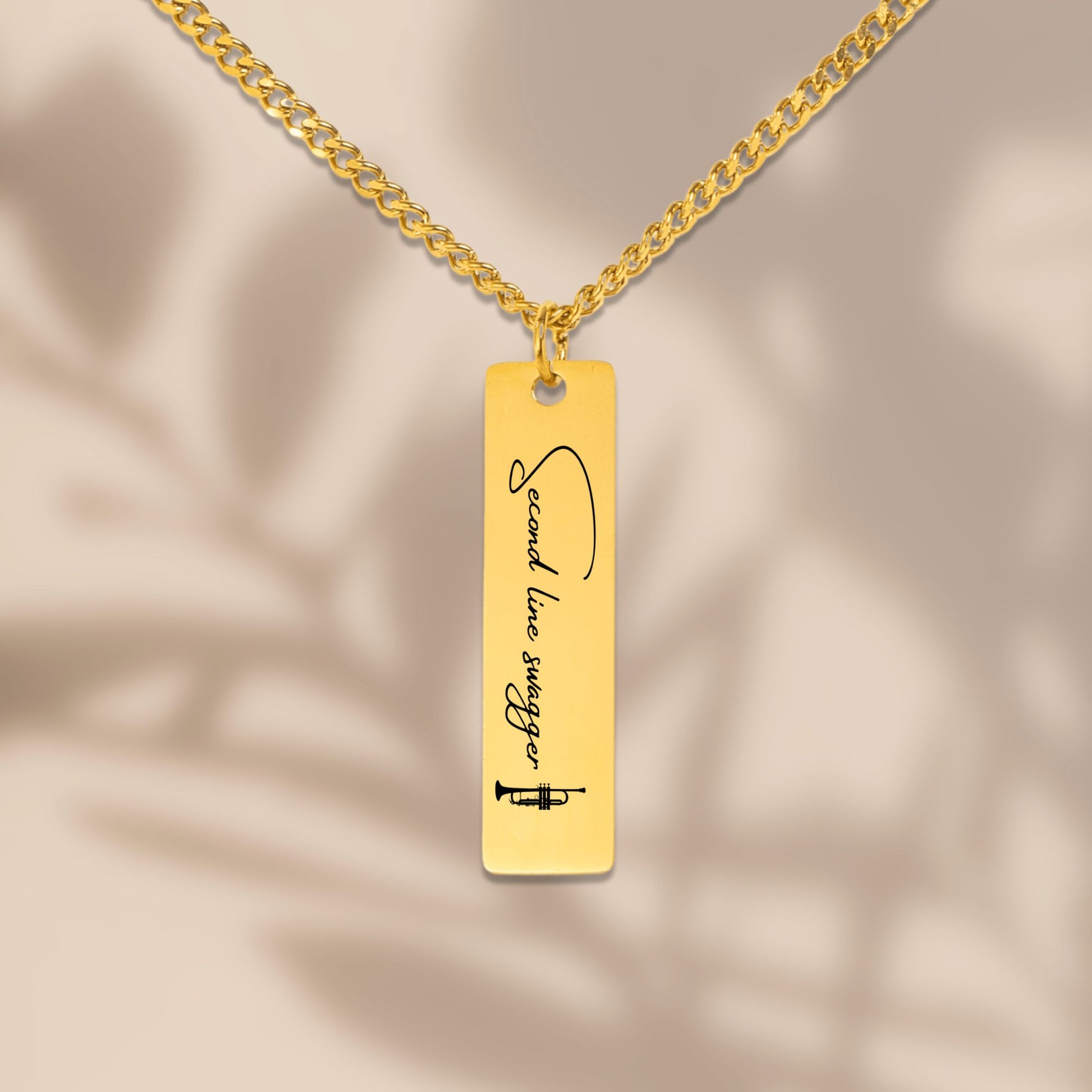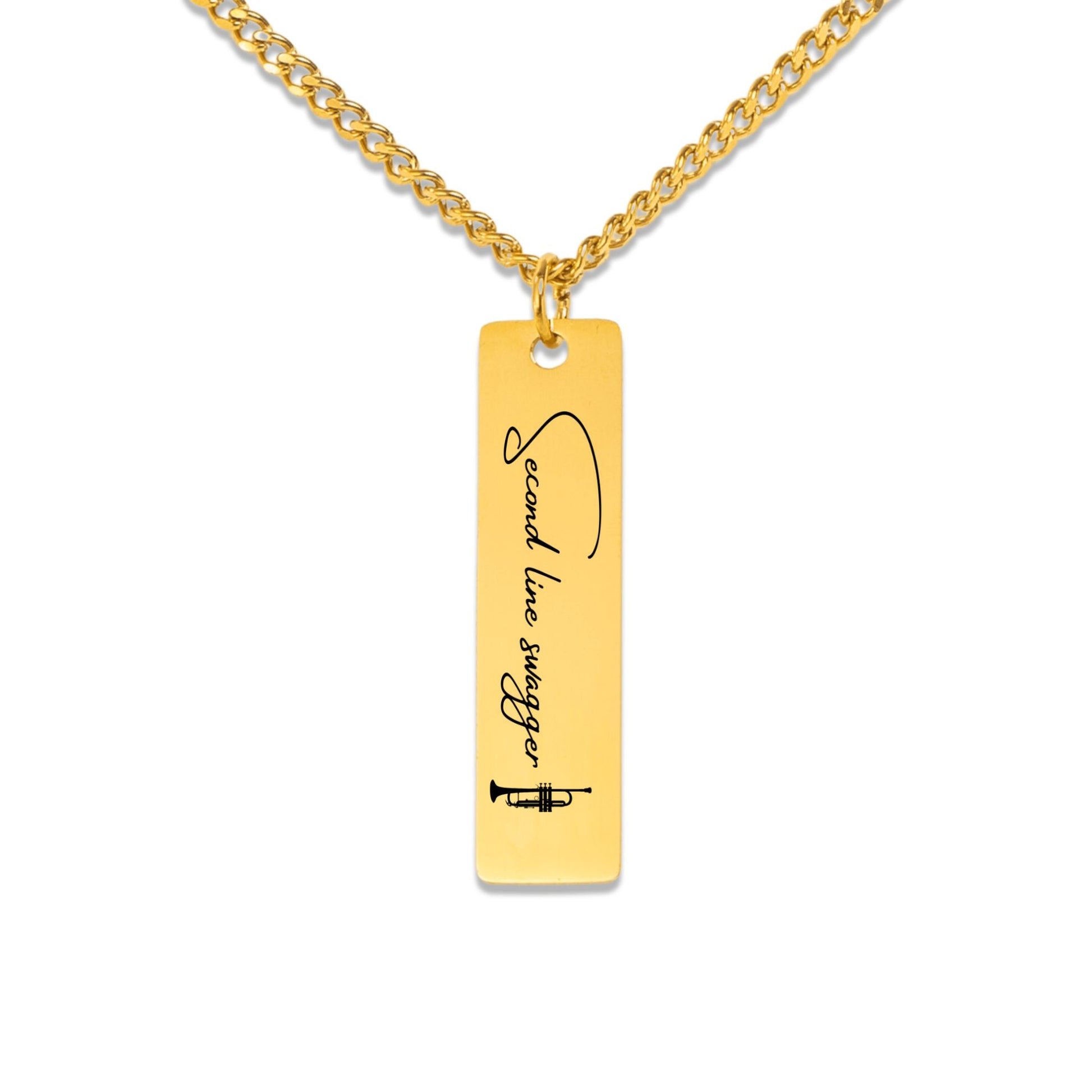 The Second Line Swagger necklace pairs a sleek vertical bar with a bold Cuban link chain — a balance of power and polish that moves like music through the streets of New Orleans.